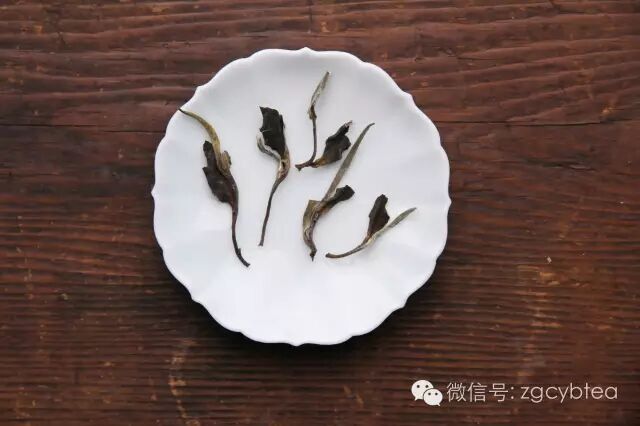 干茶一芽二葉,葉片較大,黃褐色和墨綠色混合,芽心有白色茶毫。