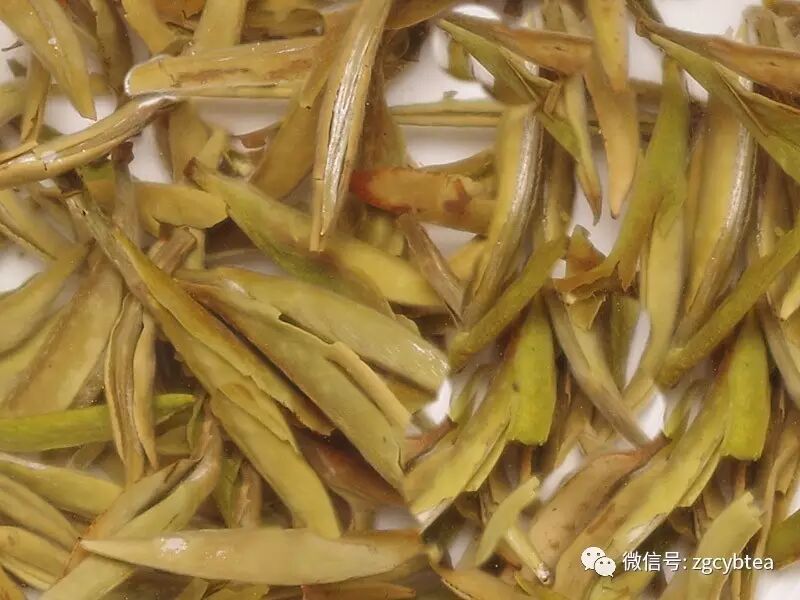 葉底多單芽,有少量單葉和一芽一二葉,顏色黃綠但偏暗,芽尖略有黑點(diǎn)。