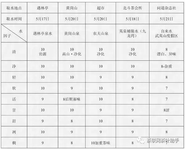? ? ? ? 為了測試武夷山不同地點的水對武夷巖茶大紅袍口感的影響,我們特意選取了遇林亭、黃崗山、武夷山莊、慧苑寺、蘭湯等地的水進行了評測,并選取了農(nóng)夫山泉、疊峰茶泉、岳口牌礦泉水、黔山秀水礦泉水以及西藏神水進行對比。