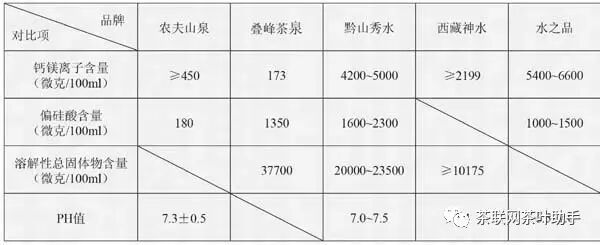 ? ? ? ? 各品牌水特征性指標對比表如下(以下數(shù)據(jù)來自各品牌產(chǎn)品包裝):