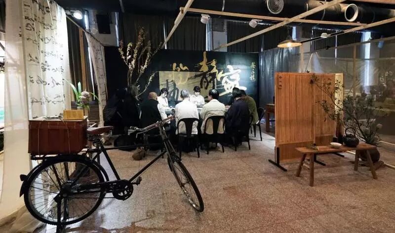 茶小樓以老自行車(chē)、板凳、蒼勁的書(shū)法大字等構(gòu)成懷舊的茶空間。