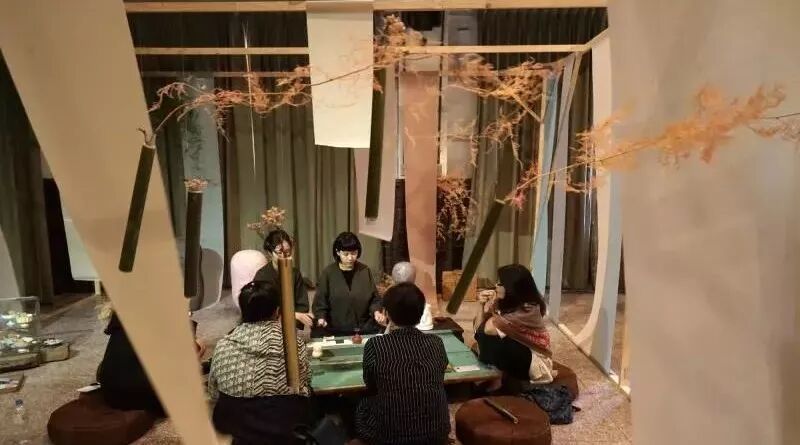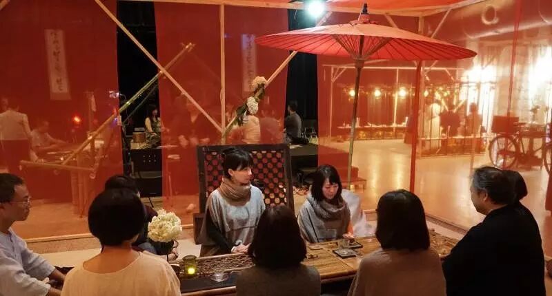 在廈門(mén)文博會(huì)第一屆“東方茶席大賽”中獲得金獎(jiǎng)的唐文菁,以“絳帳”之名,呈現(xiàn)現(xiàn)代茶空間理念,紅色絳紗、紅傘、古董窗花融為一體,如“絳紗為帳攏茶香,風(fēng)雨到此腳步輕;俗事莫上絳帳臺(tái),扶冠整心品清韻”。