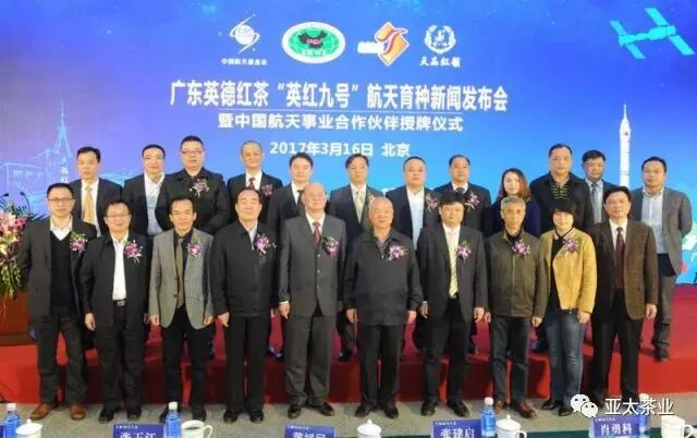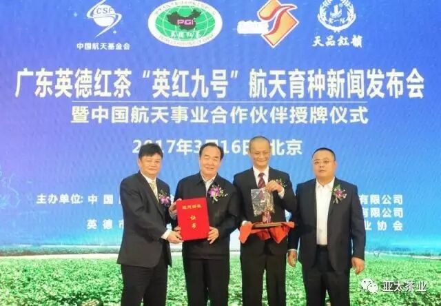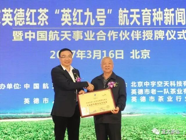 3月16日上午,廣東英德紅茶“英紅九號”航天育種新聞發(fā)布會暨“中國航天事業(yè)合作伙伴”授牌儀式,在北京航天城舉行。中國航天基金會授予廣東英德市老一隊茶業(yè)有限公司“中國航天事業(yè)合作伙伴”牌匾,同時將50克英德紅茶“英紅九號”航天種子順利交回英德。