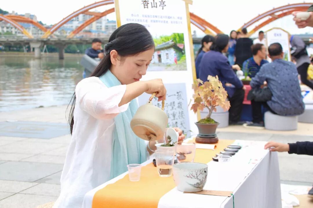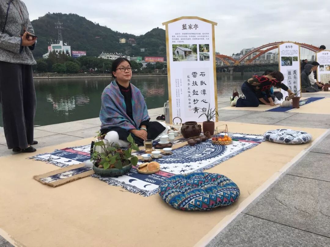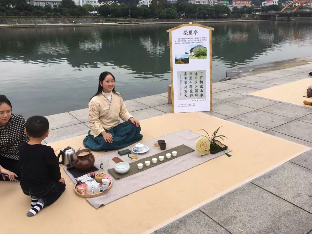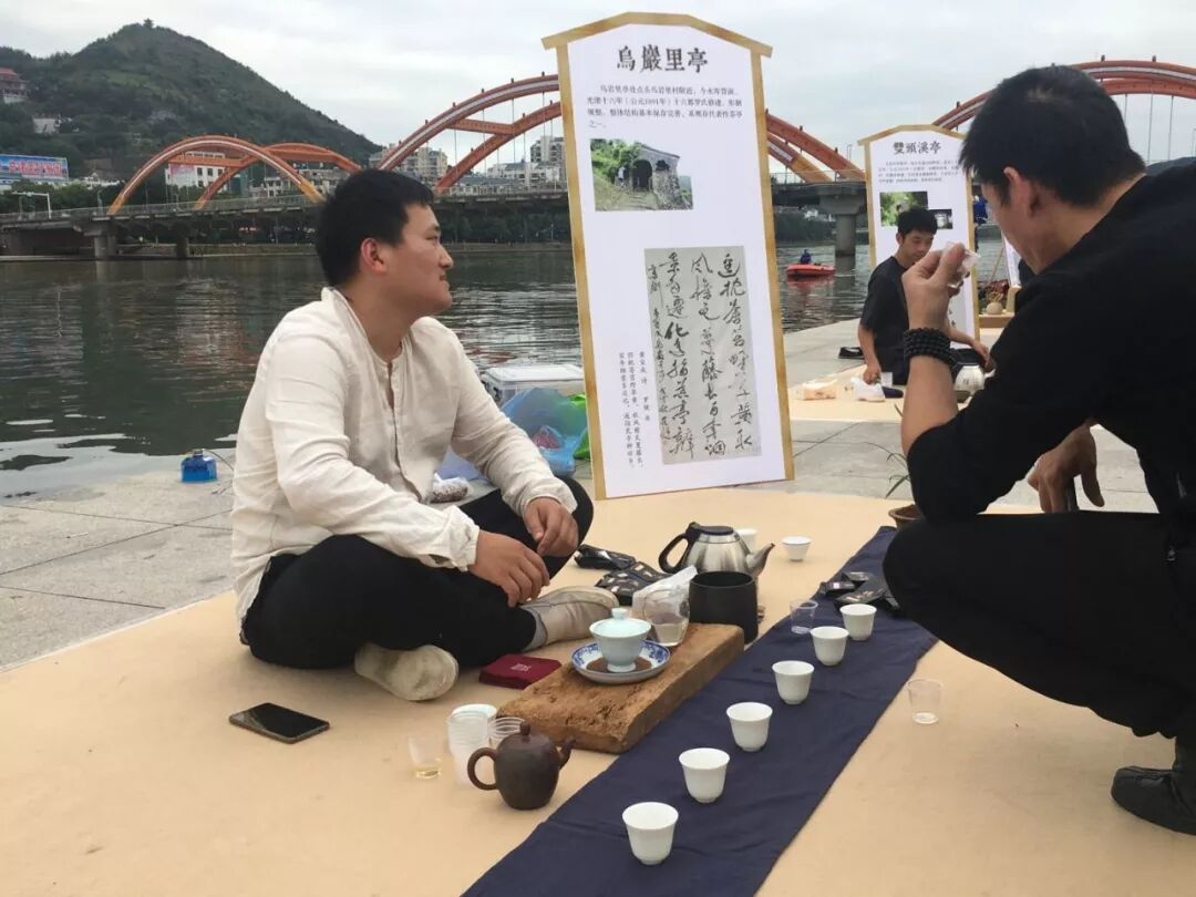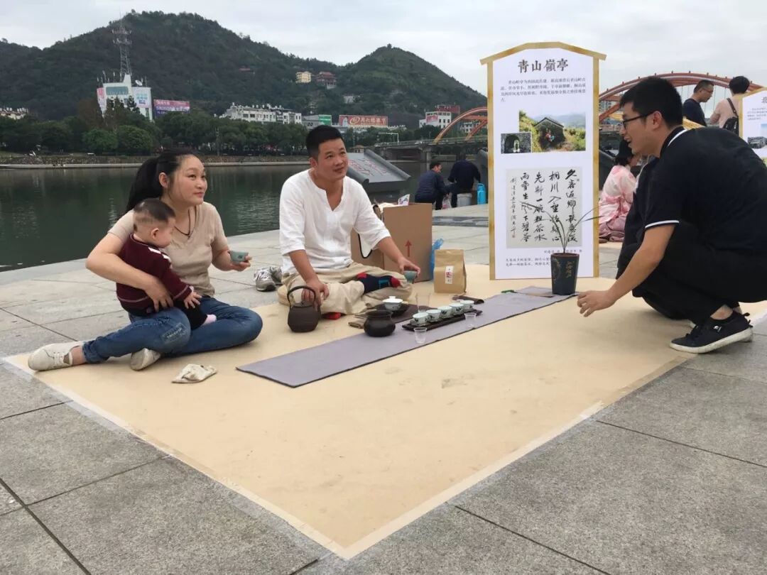 茶友席地而坐,茶亭簡介板立于左,64席沿江列陣,人們或歌或吟,或品或論,身后的桐山溪水更顯清澈,涓涓之聲仿佛就在耳邊,可以想像,一定是一幅現(xiàn)代版的“清明上河圖”。