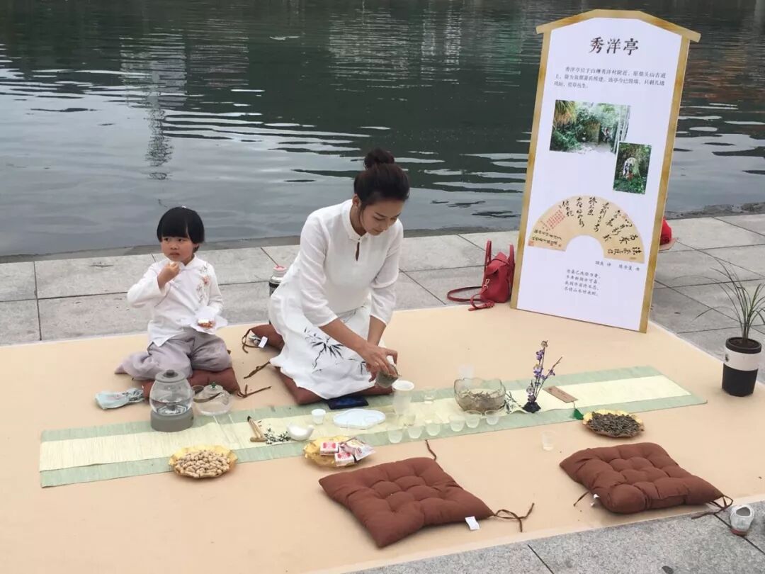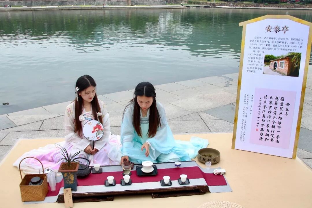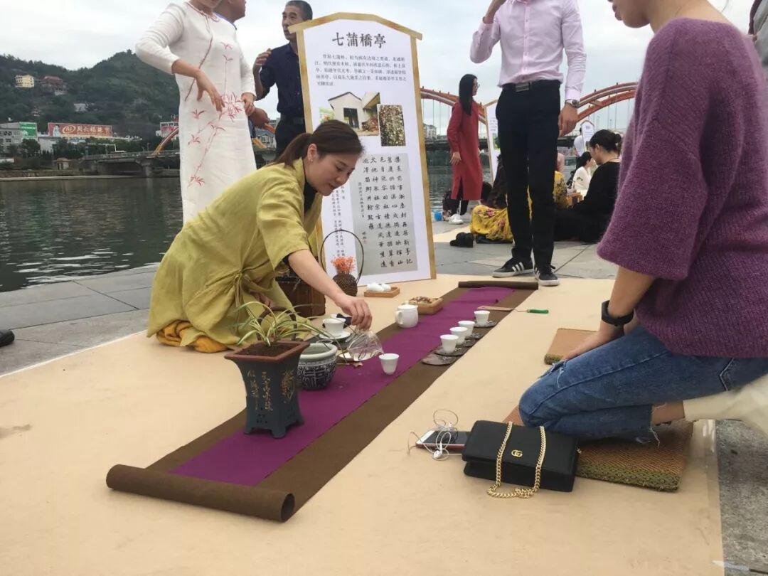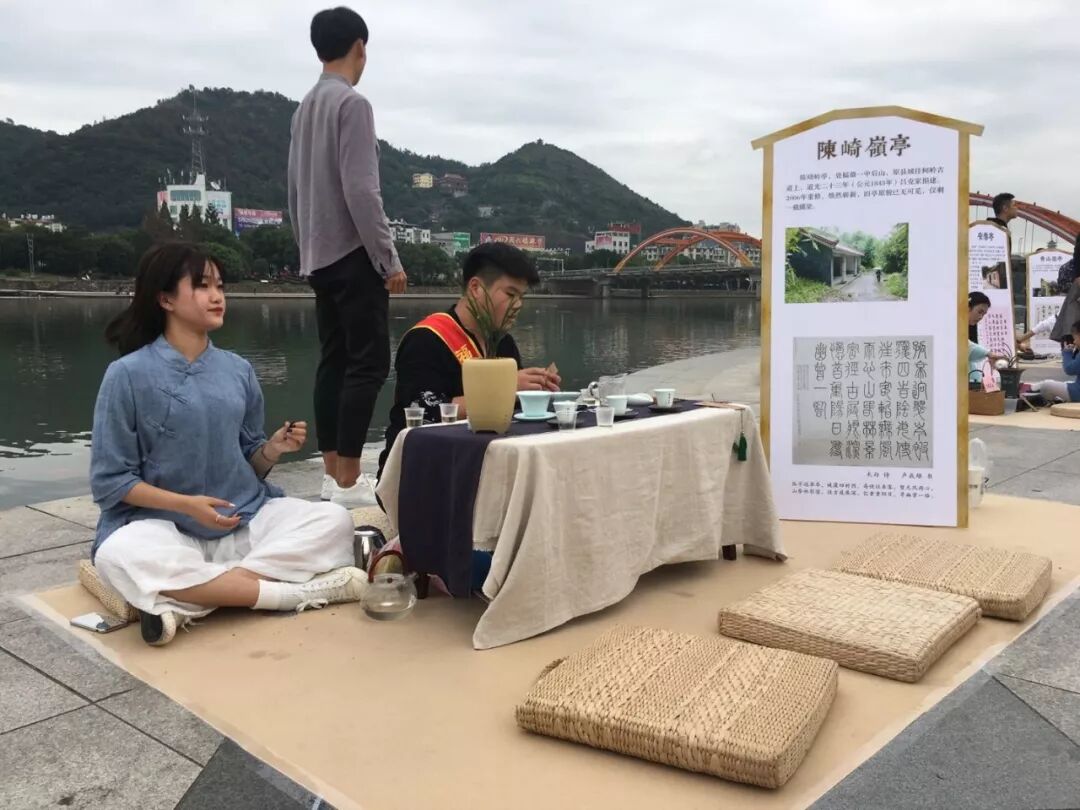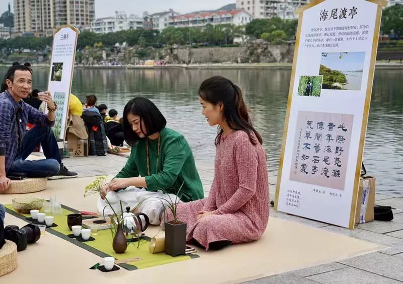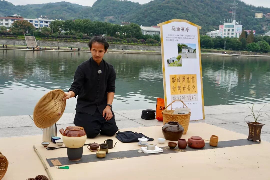 茶友席地而坐,茶亭簡介板立于左,64席沿江列陣,人們或歌或吟,或品或論,身后的桐山溪水更顯清澈,涓涓之聲仿佛就在耳邊,可以想像,一定是一幅現(xiàn)代版的“清明上河圖”。